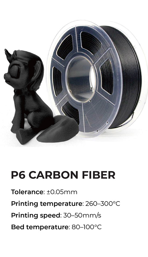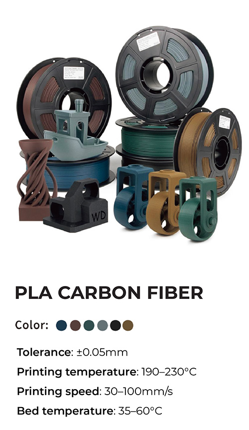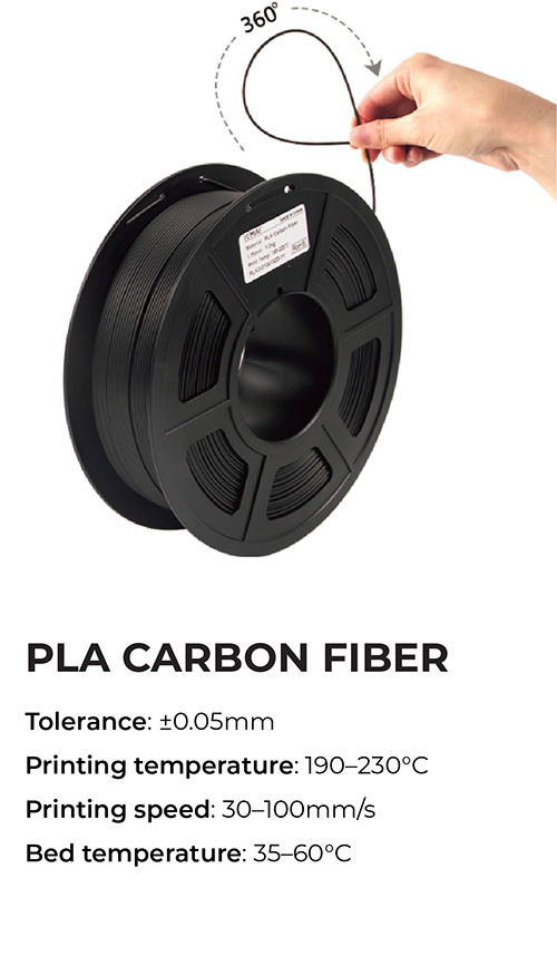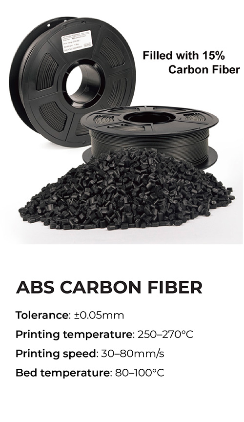 CARBON FIBER FILAMENT is a composite 3D printing material made by blending short, chopped carbon fibers with a base thermoplastic like PLA, PETG, Nylon (PA), or ASA. The result is a lightweight, rigid, and high-strength filament that enhances mechanical performance, dimensional stability, and surface finish. These filaments are perfect for functional parts that demand strength without added weight.